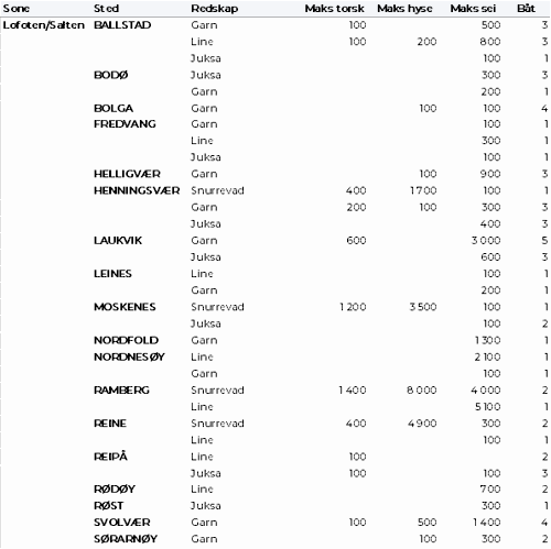 Tabell 2 og 3 viser fordelingen av landingene av fersk torsk per leveringssone og redskap (unntatt trål), med tilhørende snittpriser. De to tabellene er basert på omsetning av kvalitet A og ekstra, der alle leveringstilstander inngår, men der snittprisene er omregnet til sløyd uten hode-priser, eksklusivt restråstoff.