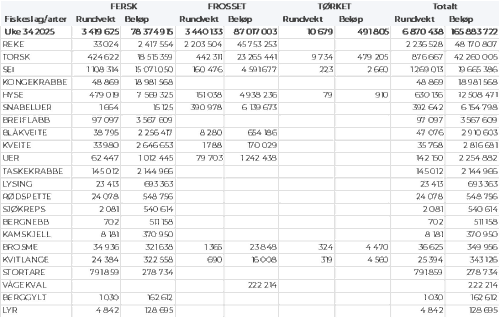 Råfisklagets omsetning for norske båter i uke 34 i år fremgår av tabell 1, med fordeling på fersk/fryst/tørket råstoff, og per fiskeslag.