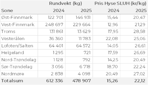 I uke 34 kom kvantum fersklevert hyse på 479 tonn til verdi 7,6 millioner kroner, litt opp fra 448 tonn til verdi 7,0 millioner kroner uken før. Tabell 5 viser sonevis fordeling av kvanta. Mest er omsatt i Vest-Finnmark med 229 tonn og Øst-Finnmark med 147 tonn. Det meste av kvantumet er tatt med snurrevad som står for 416 tonn av totalen levert av 45 båter. Av dette kvantumet er 220 tonn rapportert fangstet av 6 båter i området rundt Bjørnøya.